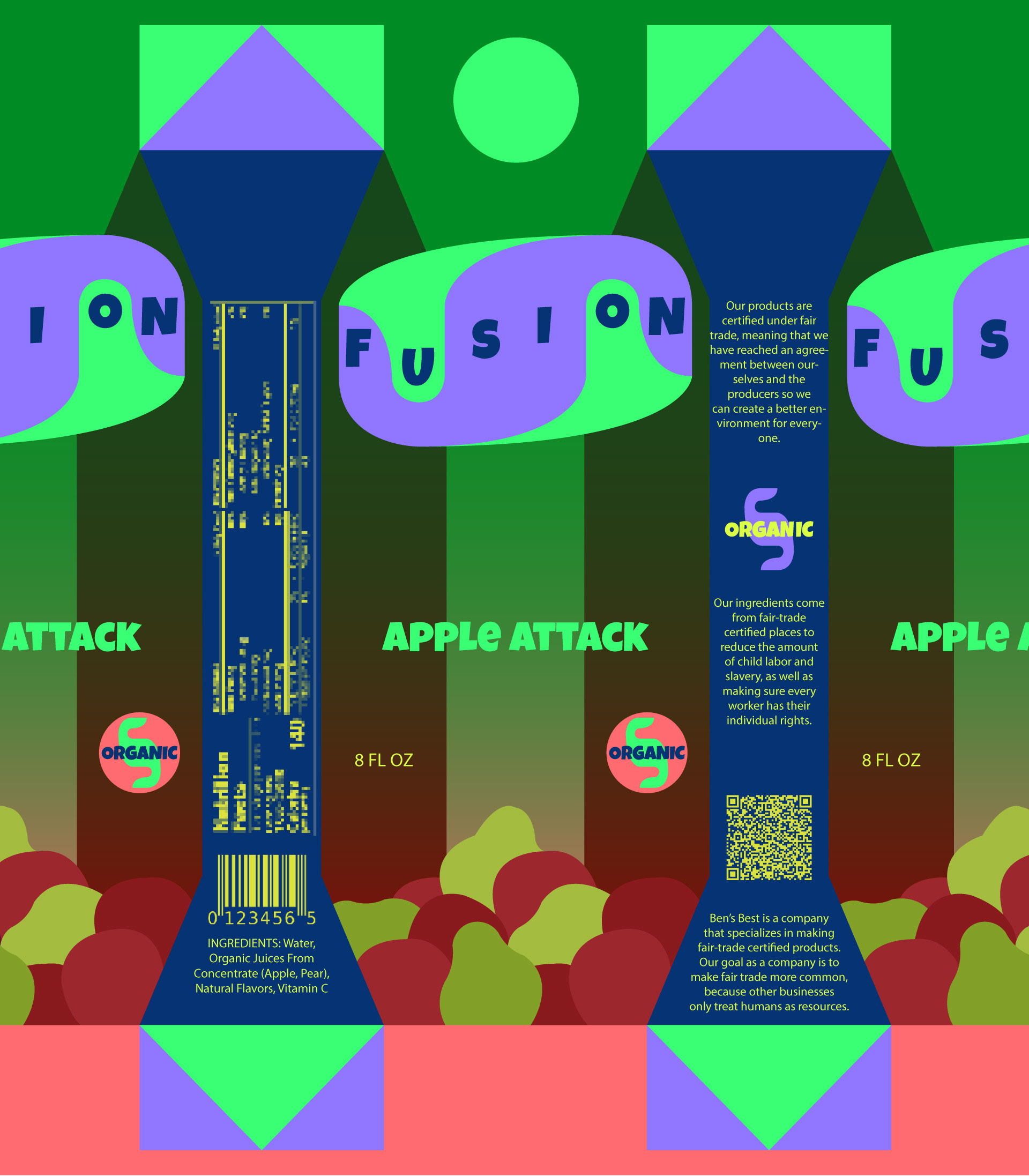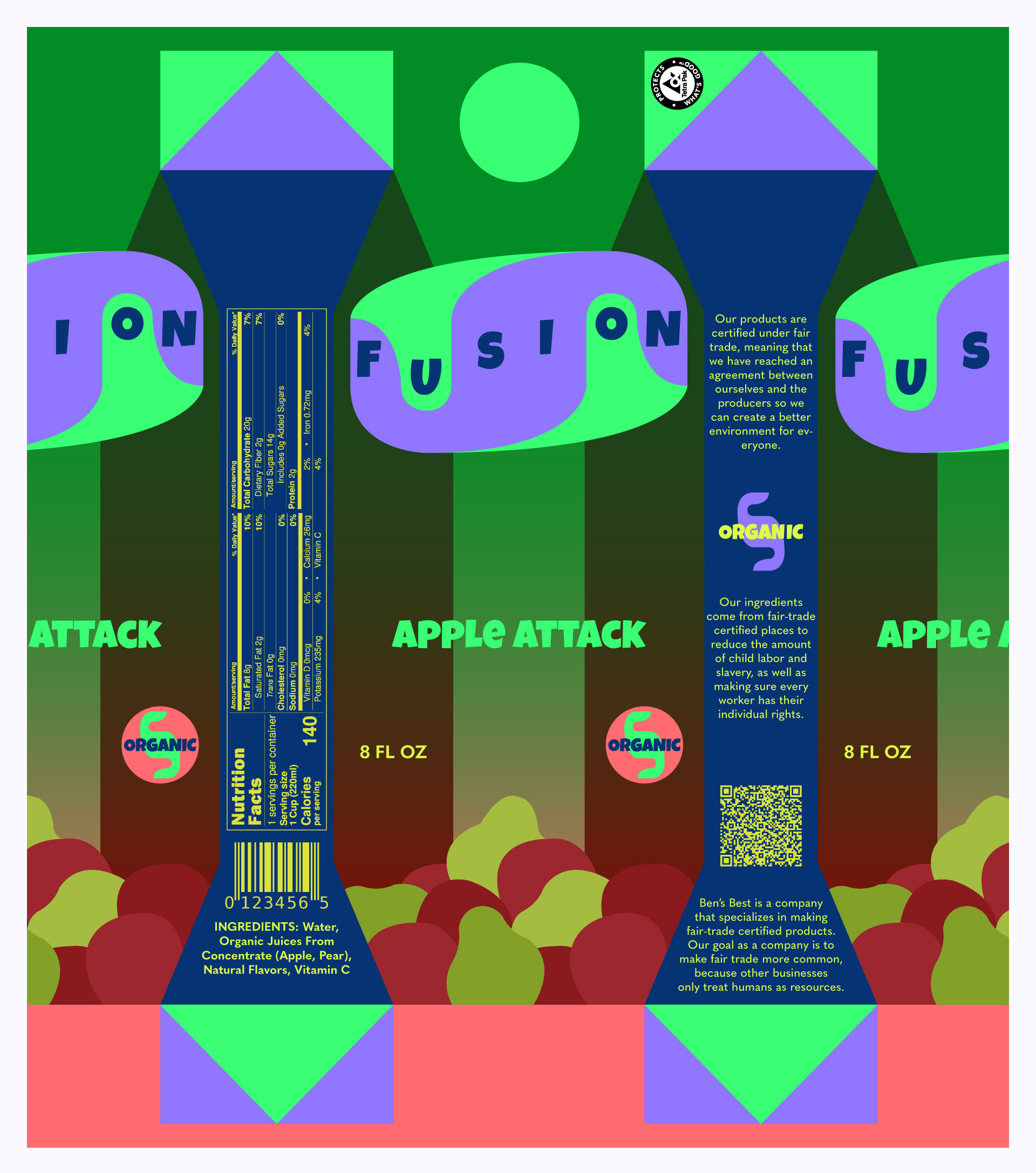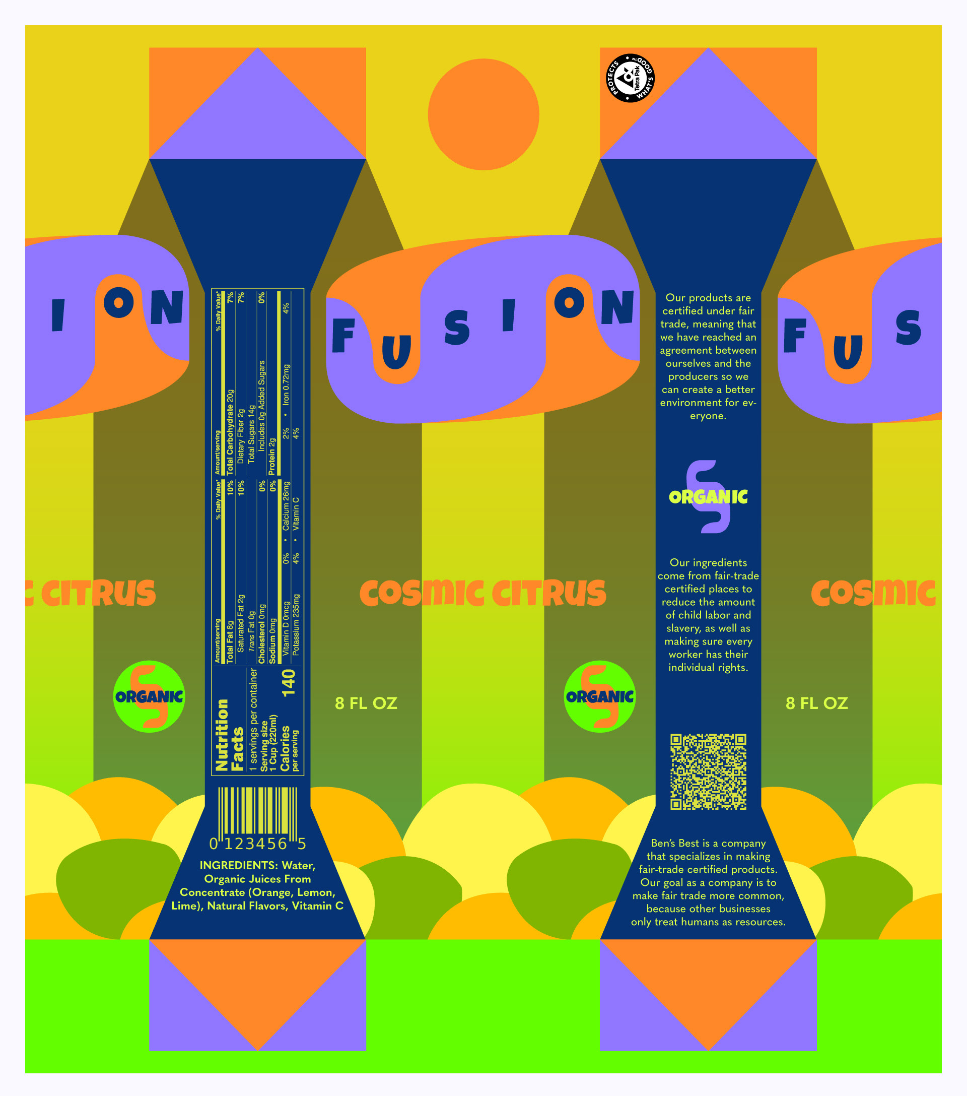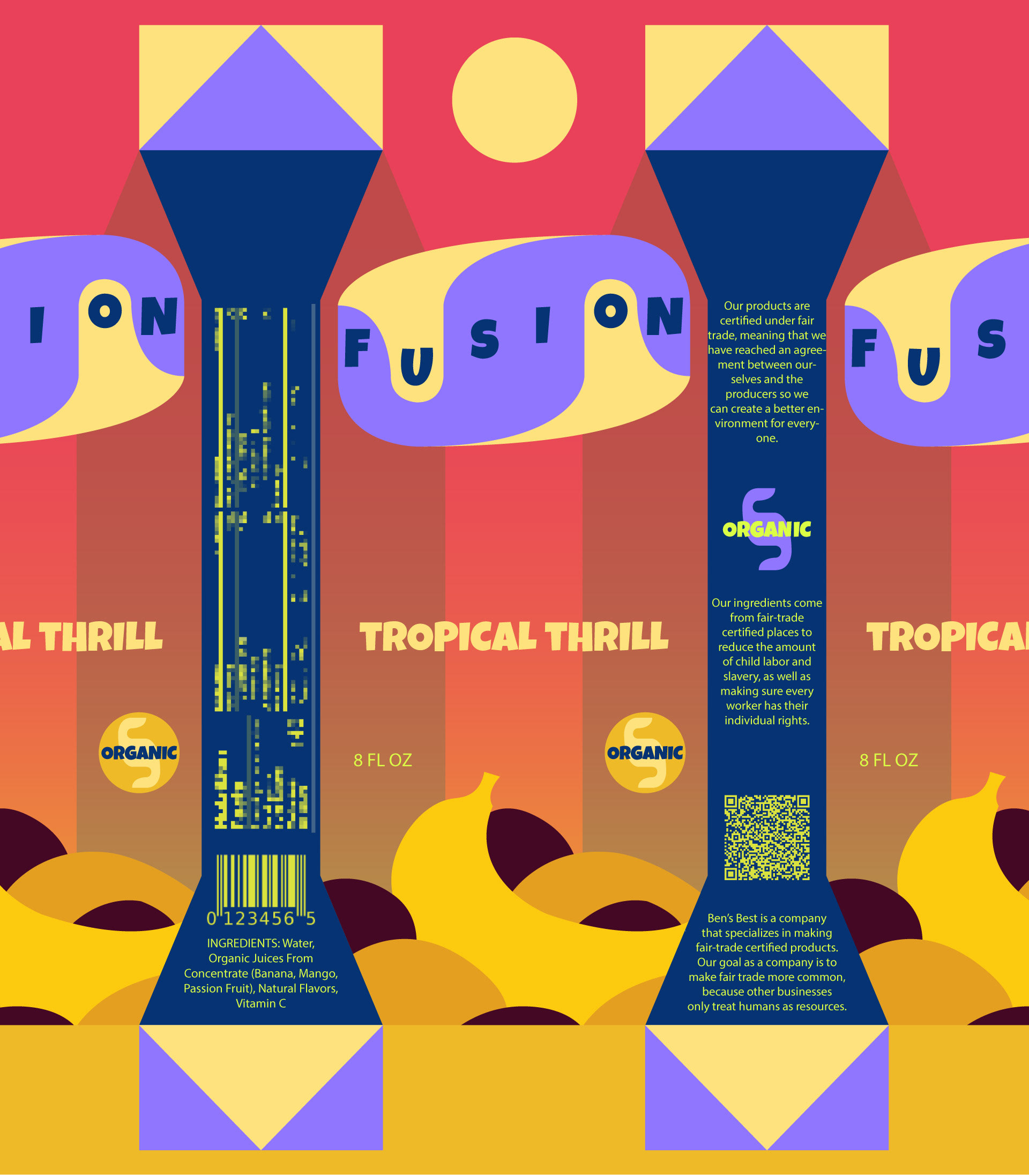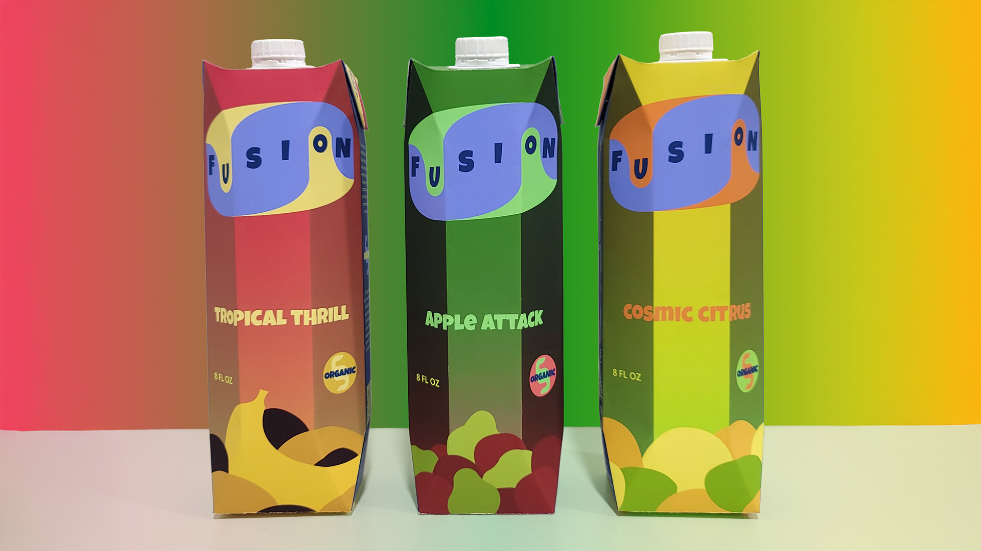 Fusion is a brand of fruit drinks targeted towards kids, designed in tetra pak packaging to reinforce fair trade and social responsibility at a young age.