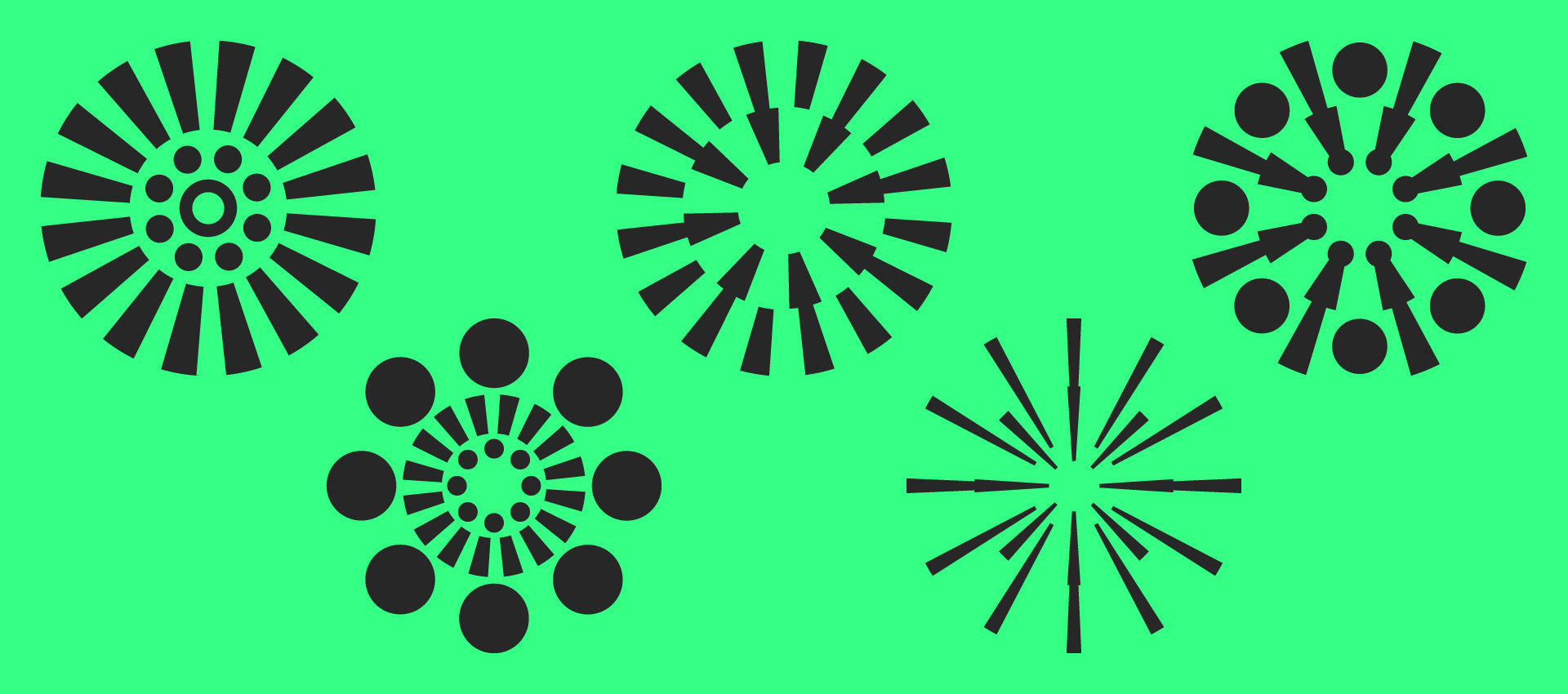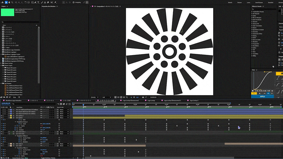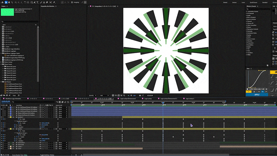 To make the rotations seamless, each element was separated and transformed into a radial, where they could be controlled more easily. Some of the paths had to be manually edited to go from flower to flower, and scale played a big factor in moving the dots and spokes around. The graph editor was used to have further control over the motion, ensuring that all of the elements popped with intent.